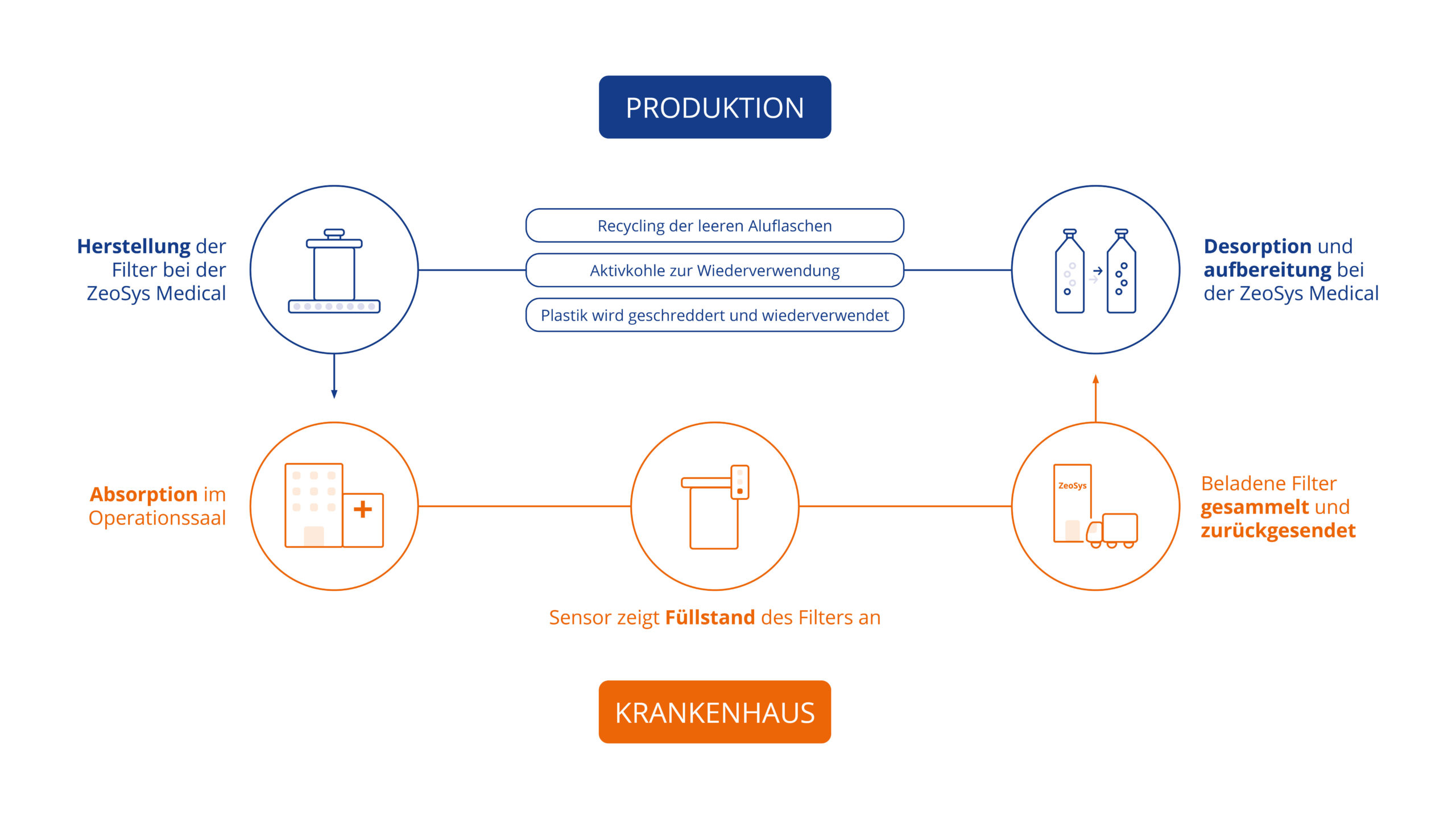 Die Klinik für Anästhesie und Intensivmedizin erprobt seit September 2021 im OP-Bereich der Gynäkologie an sechs Anästhesiegeräten Technologien zum Narkosegasrecycling. Denn alle verwendeten Narkosegase sind schädlich für die Umwelt und damit mitverantwortlich für den Klimawandel. Einen erheblichen Teil der bei einer Operation eingesetzten Narkosegase atmen die Patienten unverändert wieder aus. Bei herkömmlichen Systemen werden die Gase direkt am Narkosegerät abgesaugt und in die Außenluft abgeleitet. Neue Techniken ermöglichen es, die ausgeatmeten Narkosegase über einen zusätzlichen Aktivkohle-Filter, der mit dem Narkosegerät verbunden ist, herauszufiltern. Die Filter werden anschließend gesammelt und der Wiederverwertung zugeführt. Die so recycelten Gase können ohne Qualitätsverlust wieder verwendet werden.